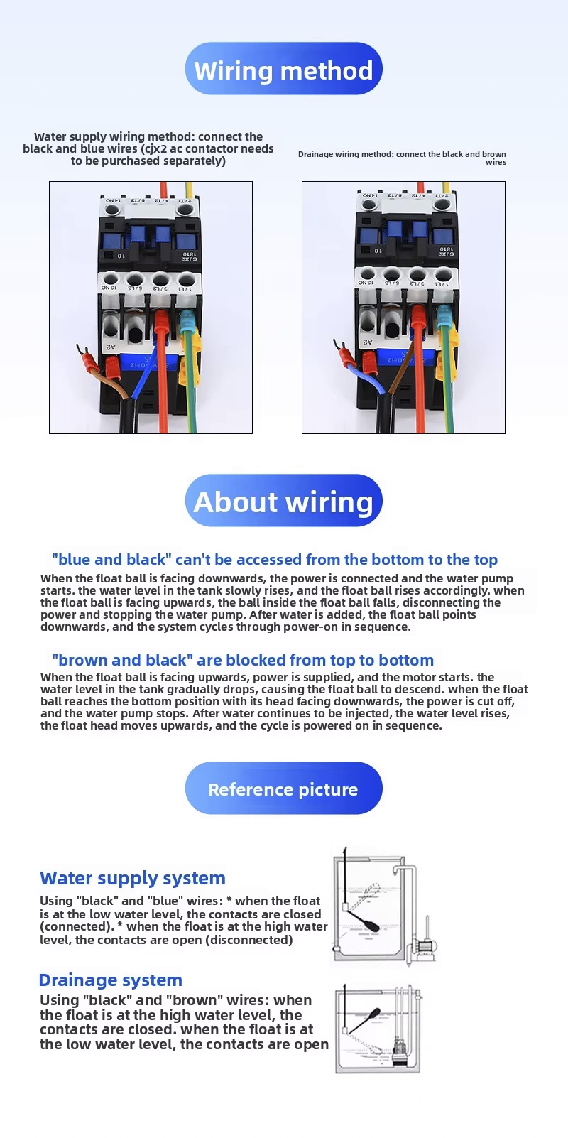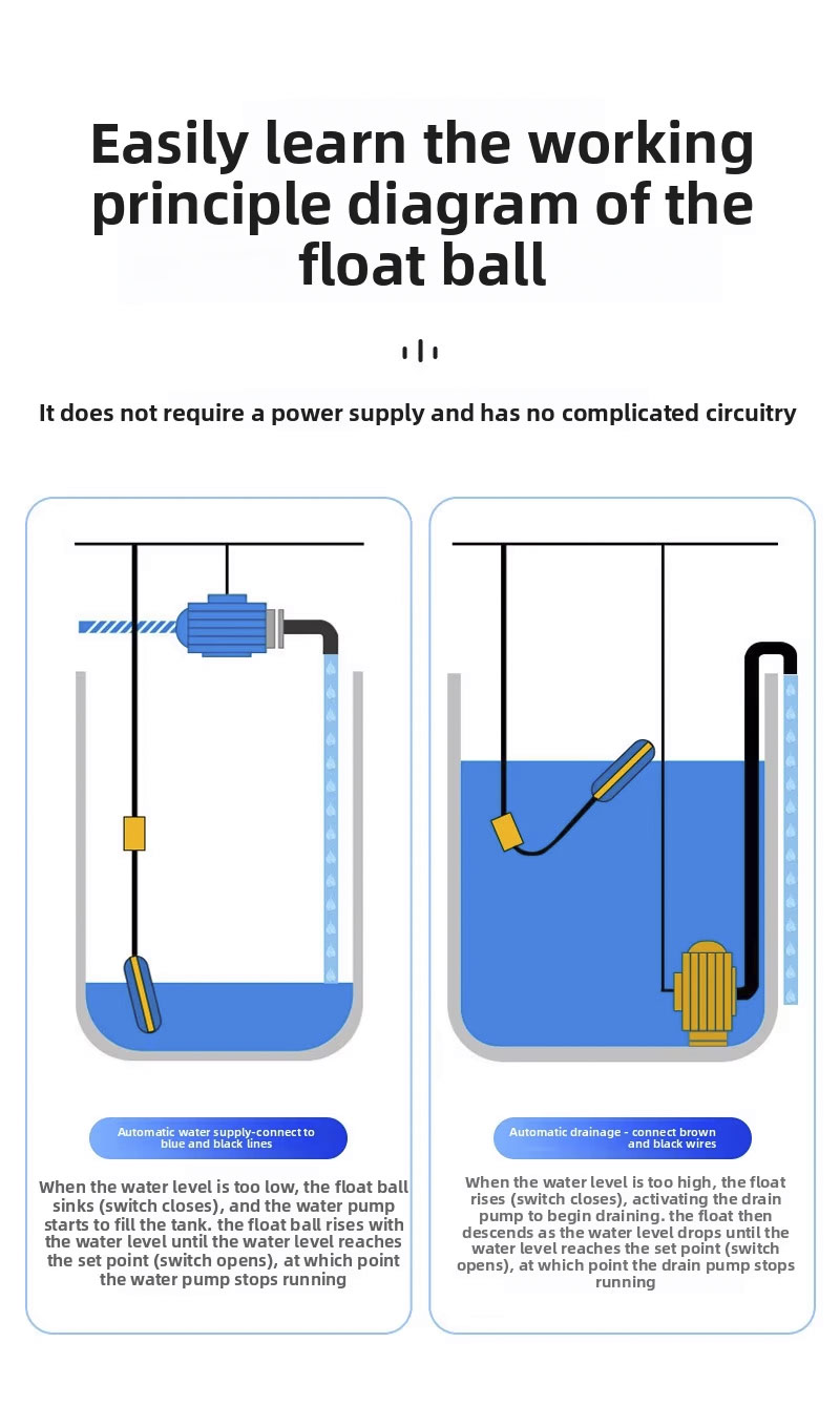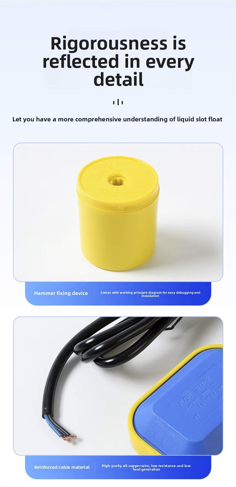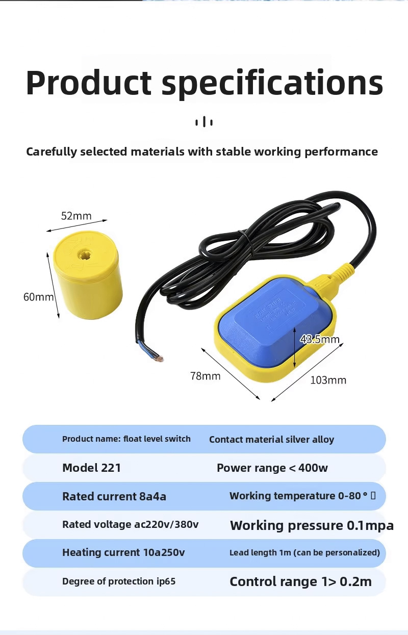 Acest întrerupător cu plutitor are un design circular mare, cu un grad de protecție IP68 de 2m、3m、5m、10m și funcționează la temperaturi de la 0℃ la 80℃, acceptă o gamă largă de tensiuni de la 110V la 220V și are o presiune de lucru robustă de ± 0,5M. Servicii OEM/ODM, asigurând adaptabilitatea pentru diverse aplicații.