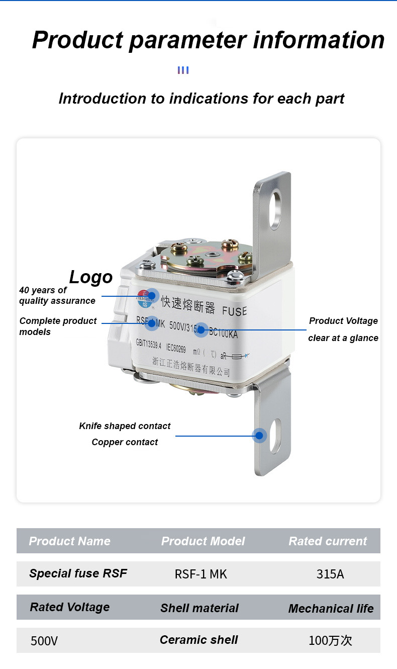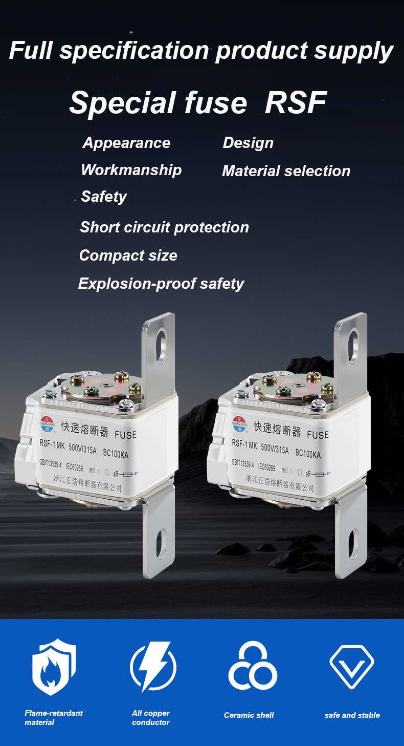are o tensiune nominală de 500 V și un curent nominal de 315 A, care poate asigura eficient siguranța electrică, poate preveni suprasarcina și scurtcircuitul. Legăturile de siguranță RSF-1K 500V-315A BC100KA